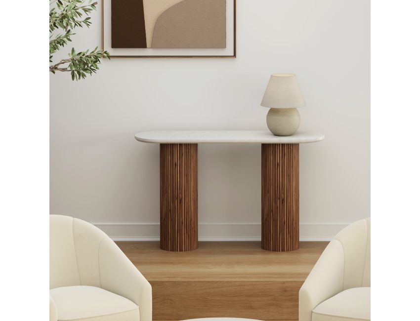 This gorgeous and sophisticated table is meticulously crafted from sustainably-sourced, solid mango wood, providing a rich and sturdy foundation. The reeded finish on the pedestal is perfectly topped with a thick, bevelled marble top creating a refined piece that will elevate your carefully designed space.