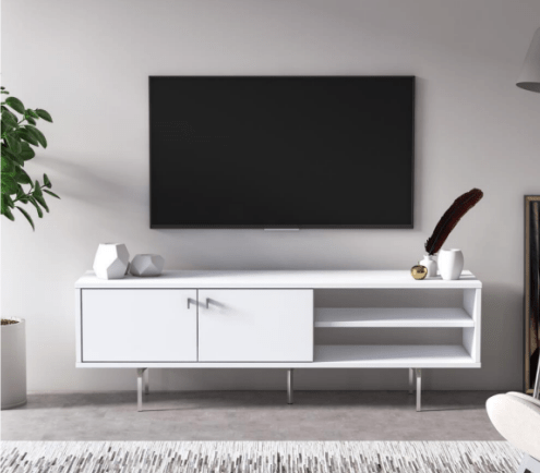 The KROS TV Unit is a clean, modern media console designed for bright, minimalist living spaces. With its crisp white finish, slim metal legs, and balanced mix of closed and open storage, it creates an airy, organized look that doesn’t overwhelm the room.